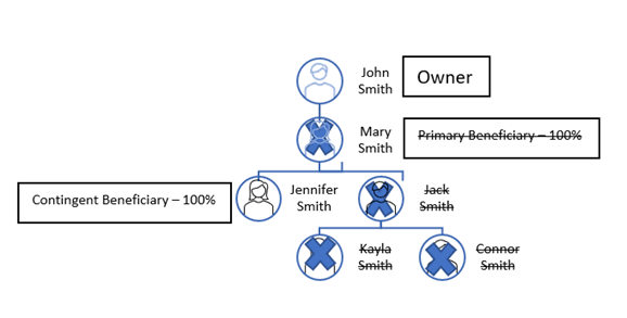 Mary Smith passed away. This leaves Jennifer and Jack as the beneficiaries. Two weeks after Mary passed away, Jack was killed in an accident. When John Smith passes away, this is what that situation would look like: