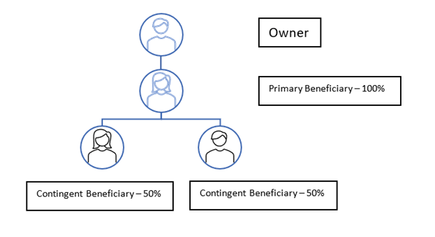 There are two types of beneficiaries, primary and contingent. A primary is your first choice, and a contingent is who would receive the funds in the event your primary beneficiary is already deceased or deceased at the same time as you, the account owner. You may have more than one primary beneficiary – the 100% account value “pie” can be divvied up how you see fit.